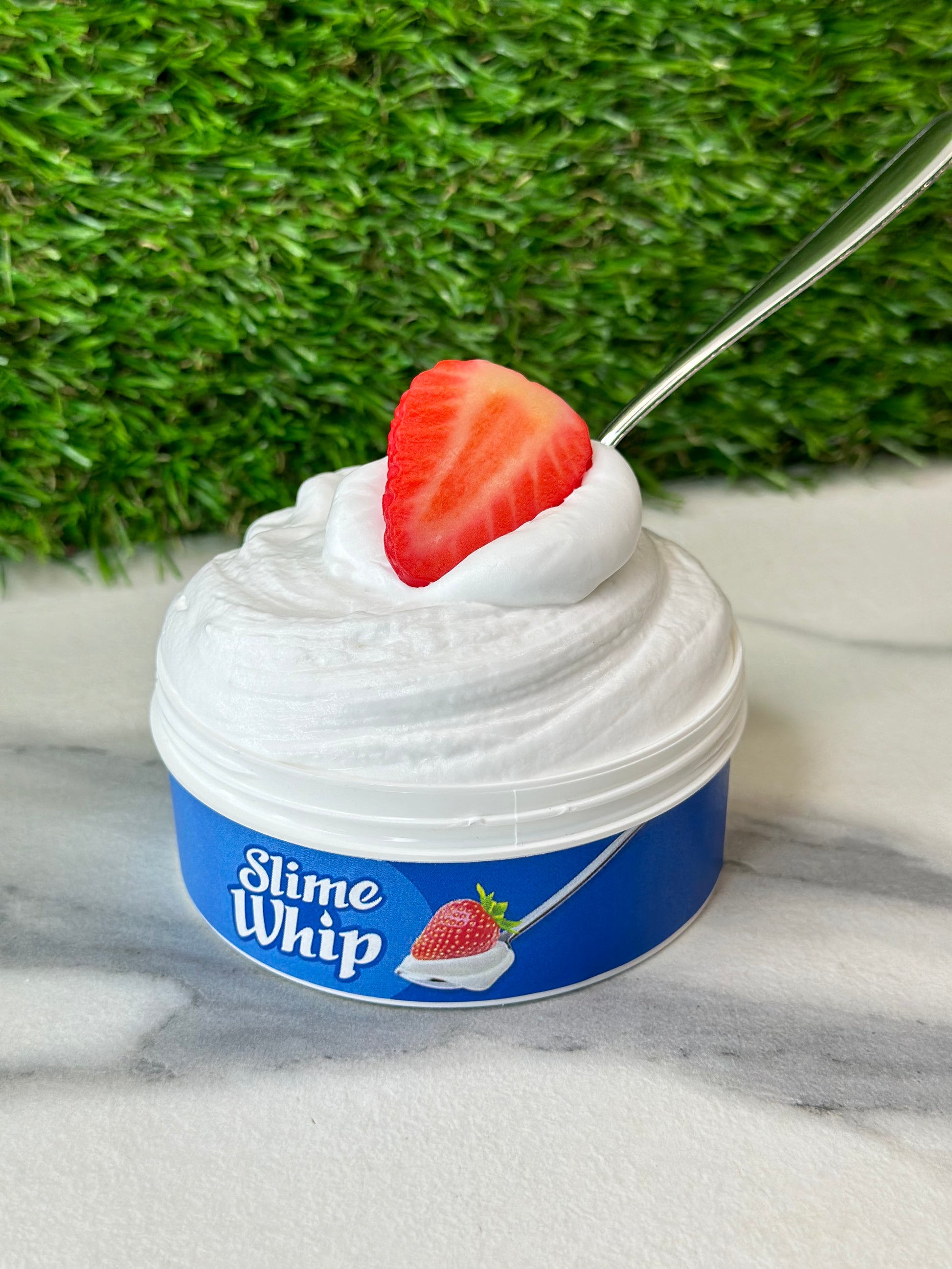 Super soft butter slime. This is super sizzling and soft. The smells is like strawberries and cream! It will arrive with a fake strawberry and a table spoon!